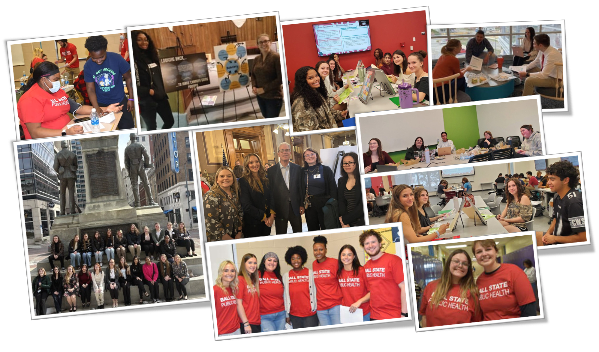 Many activities in classes in the accredited Public Health program take the students into the community. These photos depict students engaged in the Muncie community as well as Public Health Day at the statehouse.