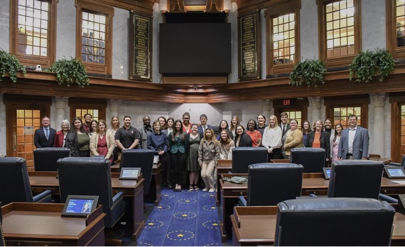 - Our POLS 370 course, Public Opinion, led by Dr. Misa Nishikawa, assisted the Bowen Center in the administration of the Hoosier Survey, giving our students the opportunity to experience first hand how major surveys are created, administered, and analyzed. At the conclusion of the survey, three of our political science majors, Hunter Case, Casen Lake, and Bryson Mills, along with Dr. Nishikawa, traveled to the Indiana Capitol to present the results.